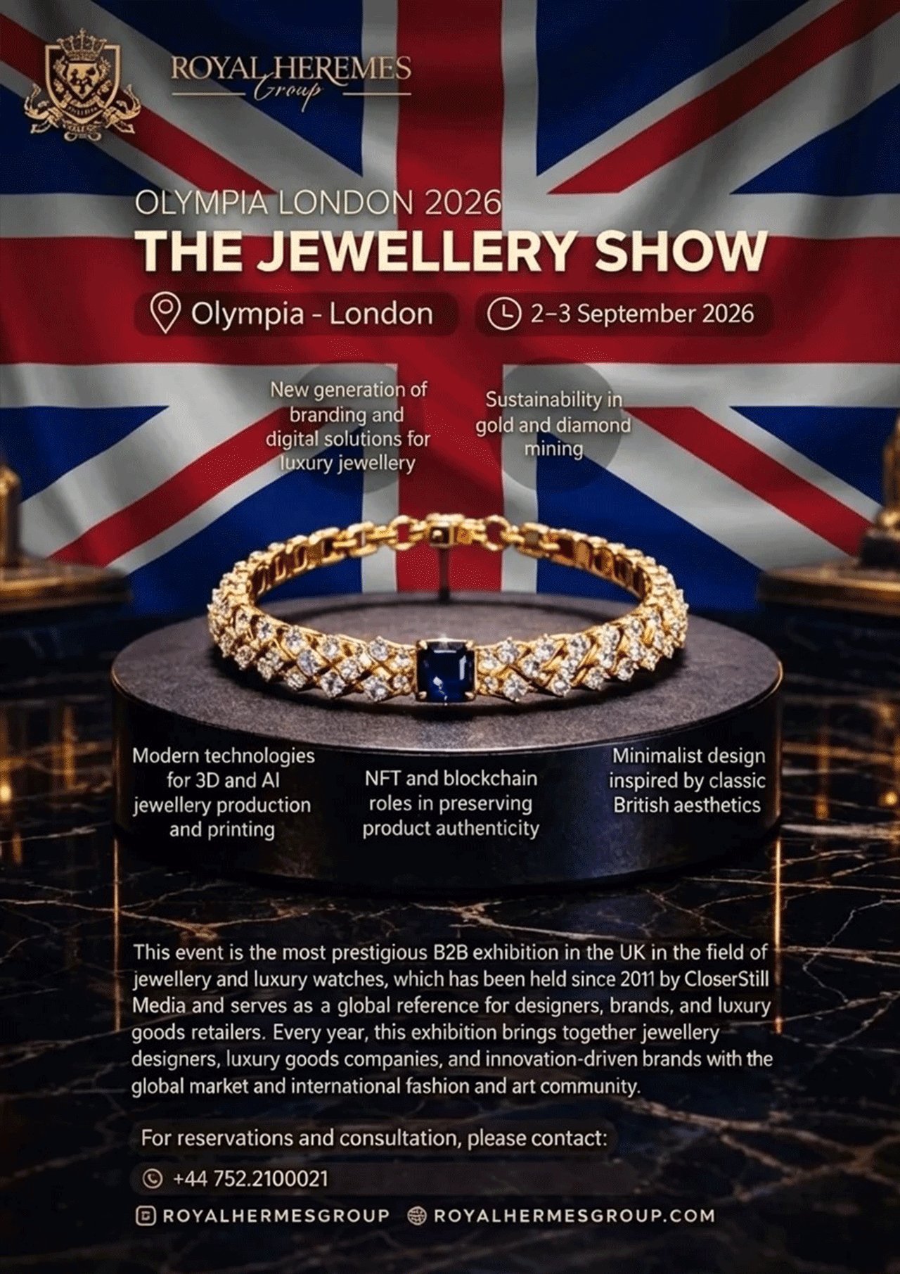 Royal Hermes Group leverages the London Jewelry Show as a strategic platform to present rebranded international jewelry collections to the UK luxury and retail market. As a leading exhibition for designers, manufacturers, retailers, and buyers, the event provides direct access to key decision-makers across the jewelry value chain. Through a refined and carefully curated exhibition presence, Royal Hermes Group showcases how international products are transformed into distinctive, market-ready UK brands that meet local quality, compliance, and design expectations. Our participation elevates brand perception, enables high-value trade partnerships, and accelerates market penetration within the UK jewelry sector.